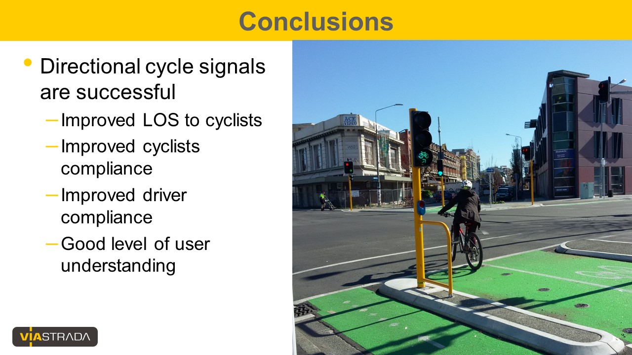 To address this problem, Christchurch City Council and Auckland Transport commissioned ViaStrada to conduct an official traffic control device trial of directional traffic signals for cyclists.  The new signals have been installed at four intersections.  Assessments of user behaviour (compliance and conflicts), user understanding, and user satisfaction have been undertaken at three of the intersections and will soon be carried out at the fourth.