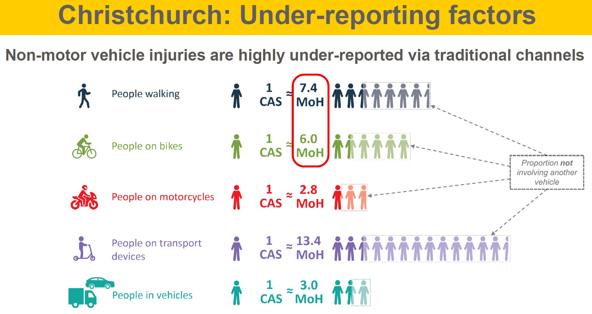 Traditionally, serious pedestrian injuries on our streets and paths are captured by Police reporting (e.g. CAS), which tends to overlook several incidents resulting from slip, trip and fall events. Using ACC and hospital admission data, the true scale of these injury numbers was identified from four recent case studies: